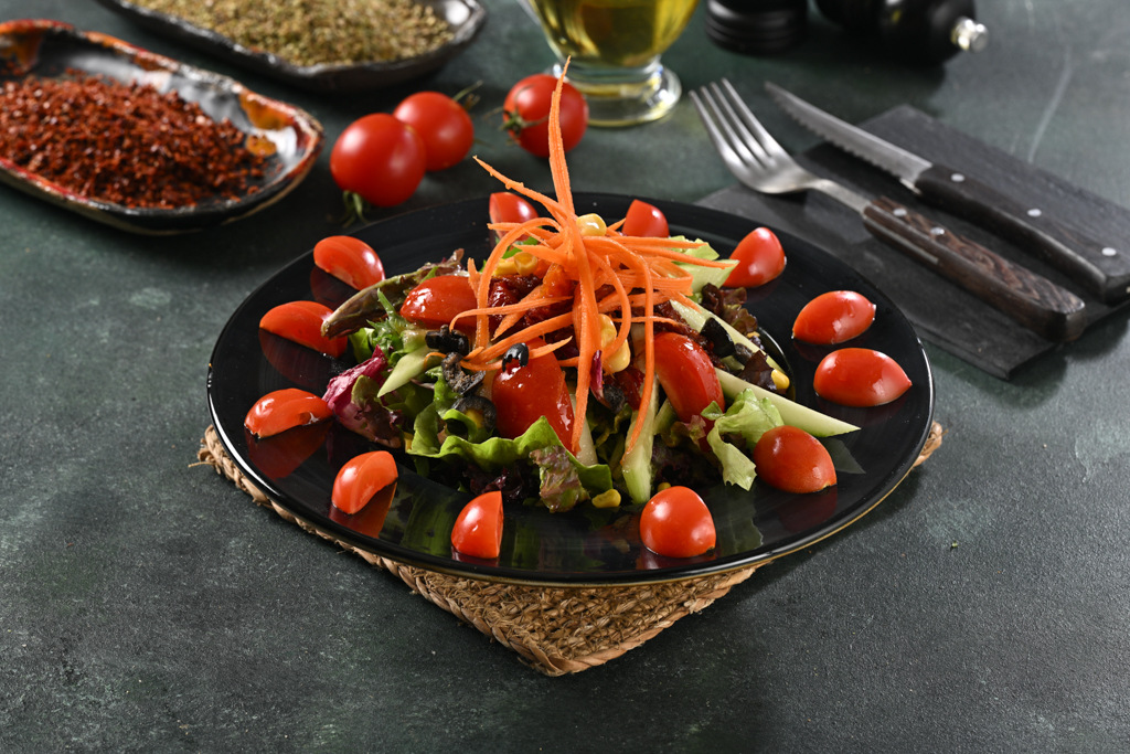 Akdeniz yeşillikleri, domates, salatalık, dilim siyah zeytin, mısır ile.