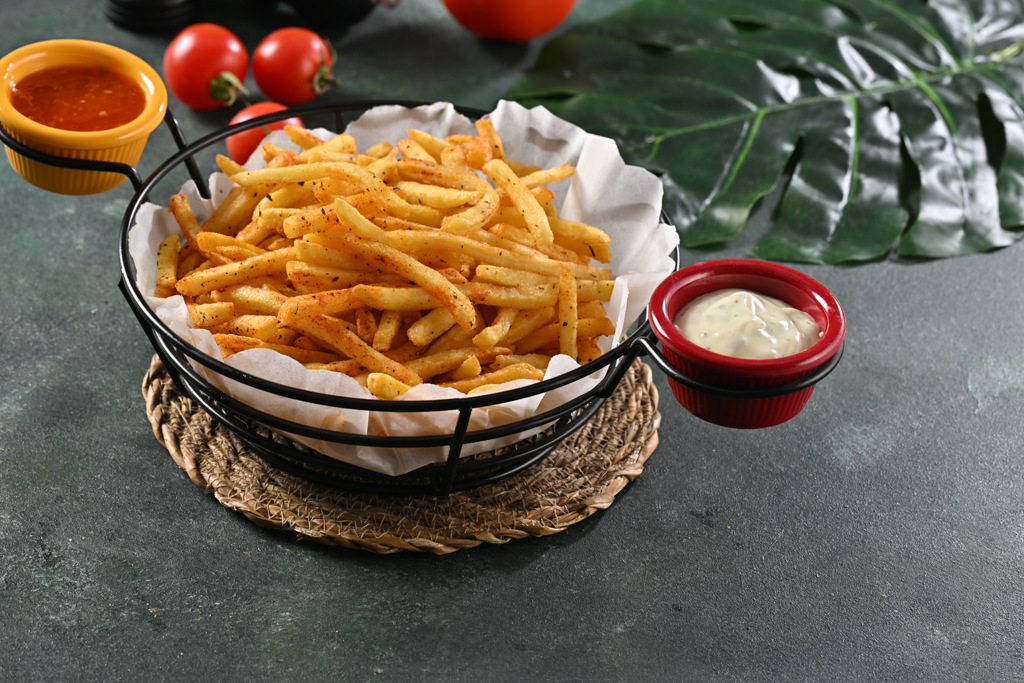 Parmak patates, cajun baharatı, chelli sos, roka sos ile