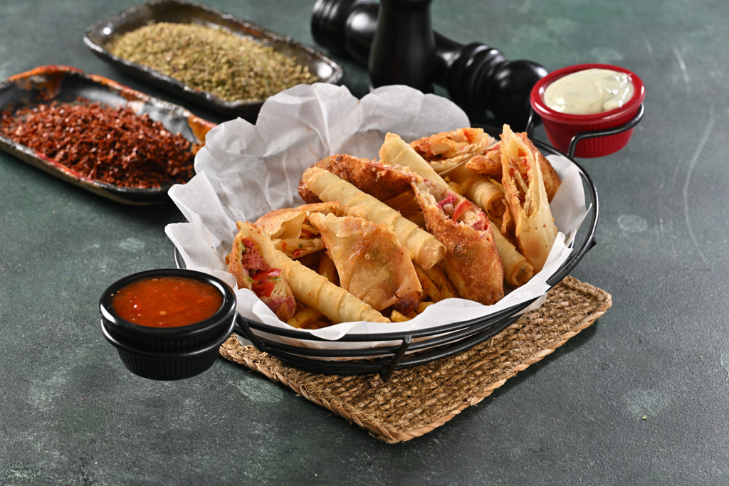 Tavuklu börek, paçanga böreği, sigara böreği, parmak patates, chelli sos, roka sos ile