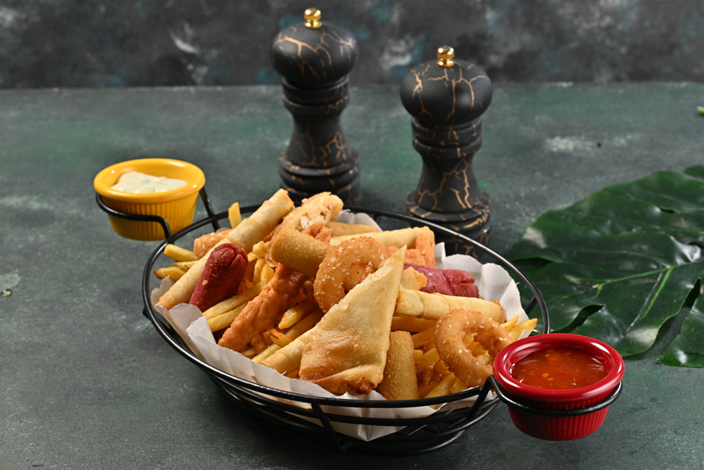 Sigara böreği, tavuklu börek, soğan halkası, patates kroket, çıtır tavuk, parmak patates, sosis, chelli, roka sos ile